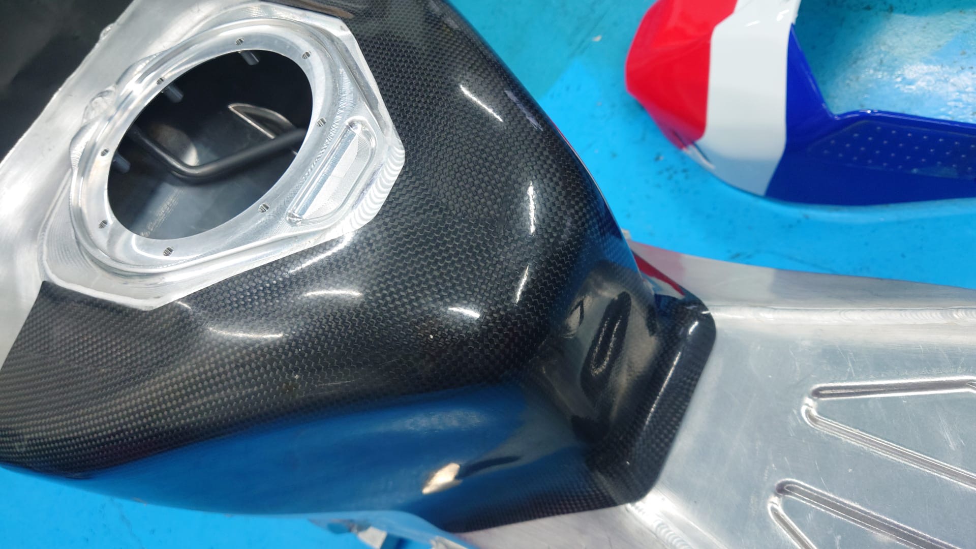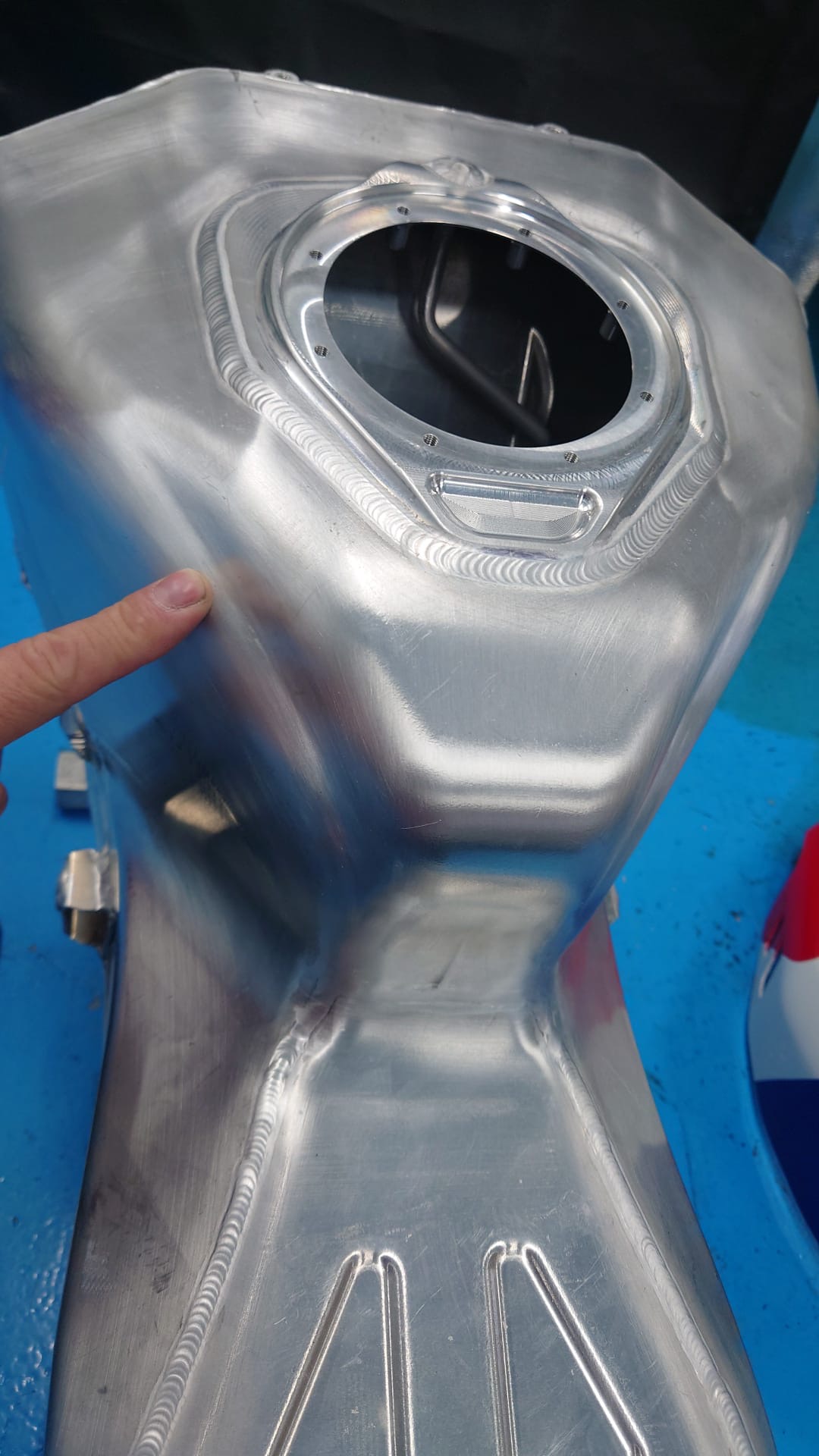写真はアルメリアテストでライダーからタンクの形状変更を依頼され新たなカバーを作った。少しでもライダーが楽になれば何でもやる!わかりやすいように古いタンクと新しいカバーの二枚を見せよう。